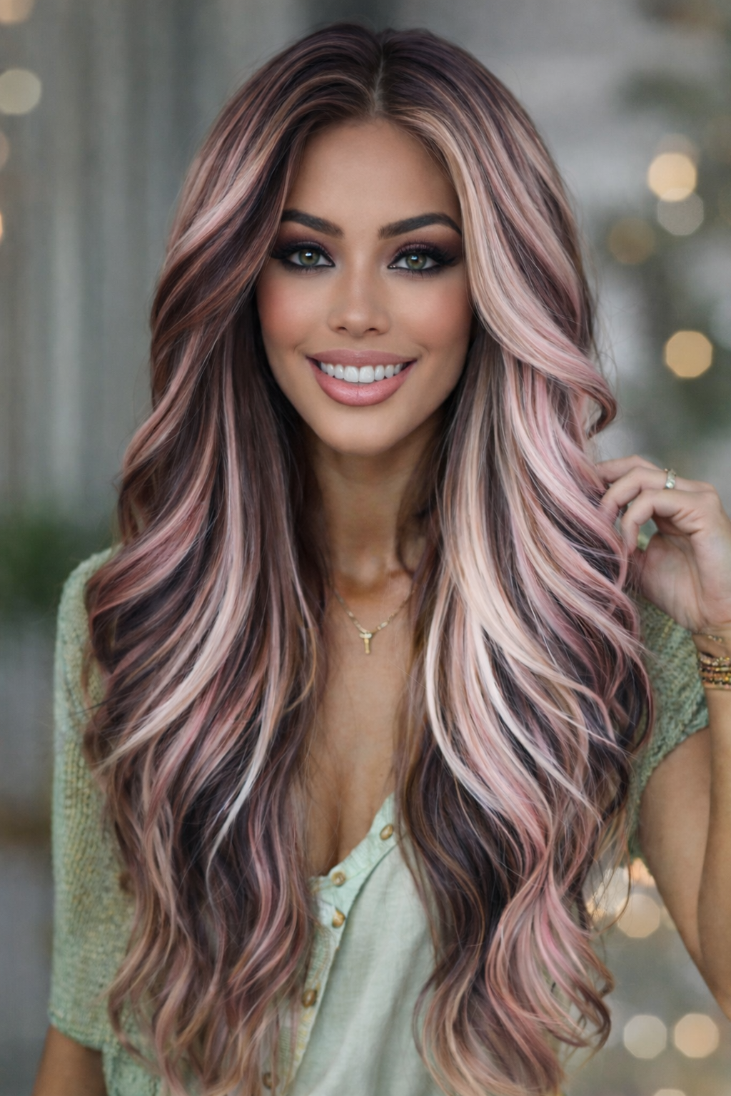 A smoky brunette base infused with muted rose-mauve and soft ash-beige ribbons for an airy, romantic finish that feels ethereal, modern, and unmistakably luxe.